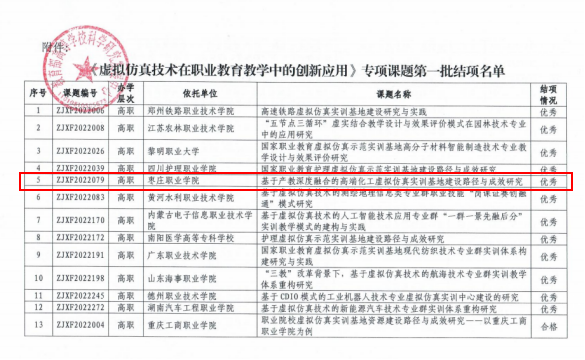 近日,教育部高等学校科学研究发展中心公布了《虚拟仿真技术在职业教育教学中的创新应用》专项课题结题情况,由我校化工与制药系申报的课题《基于产教深度融合的高端化工虚拟仿真实训基地建设路径与成效研究》顺利通过审核,以优秀档次结题,位列山东省第一,全国第五。