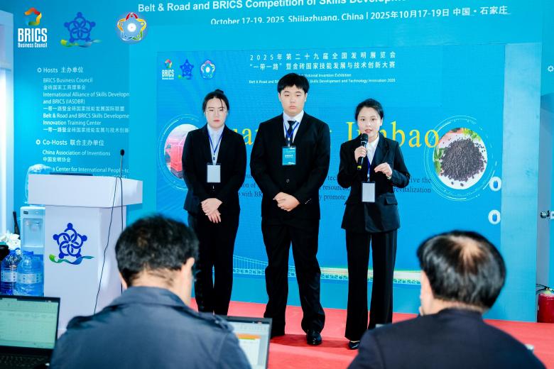 10月19日,2025年第二十九届全国发明展览会“一带一路”暨金砖国家技能发展与技术创新大赛在河北省石家庄市国际会展中心圆满落幕。我校化工与制药系参赛团队凭借扎实的专业功底和突出的创新能力脱颖而出,最终荣获二等奖一项、三等奖一项,为学校赢得了国际声誉。