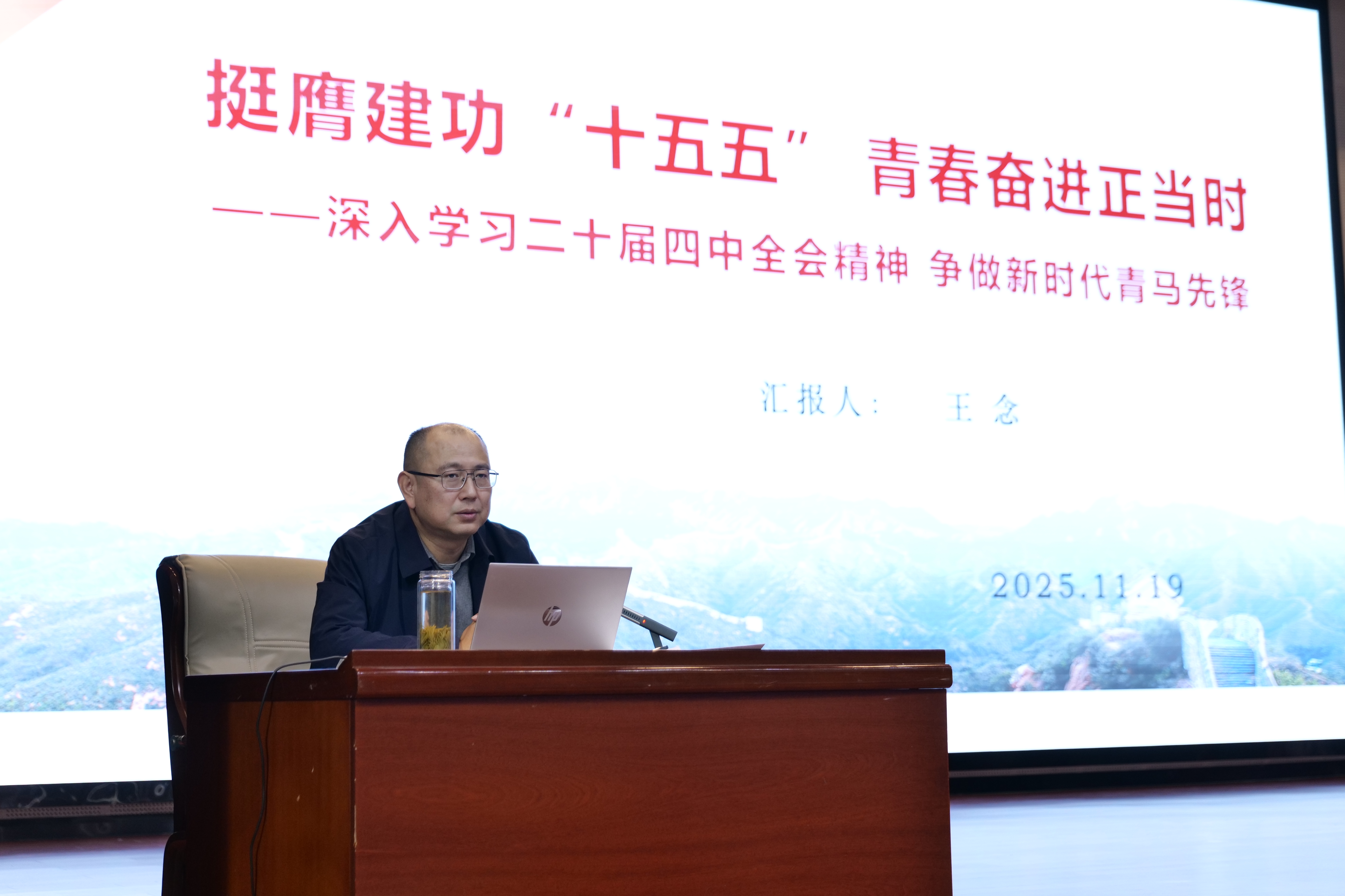 11月19日下午,学院党委委员、副院长王念在学院2025-2026学年“青年马克思主义者”培训班结业仪式上为师生讲党课。机关第四党支部党员,各系(院)党支部书记、团总支负责人、辅导员代表及“青马班”全体学员一同聆听了党课。