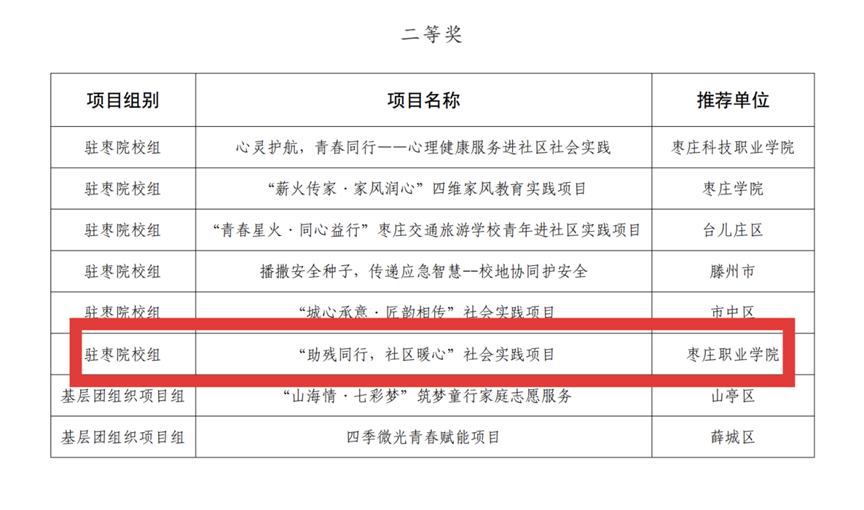为深入贯彻落实习近平总书记关于青年工作的重要思想,积极响应“百万大学生进社区”社会实践号召,学校积极组织参与由共青团枣庄市委主办的2025年枣庄市“百万大学生进社区”社会实践项目大赛,在比赛中凭借扎实的实践成果与高质量的项目展示,荣获多项荣誉。