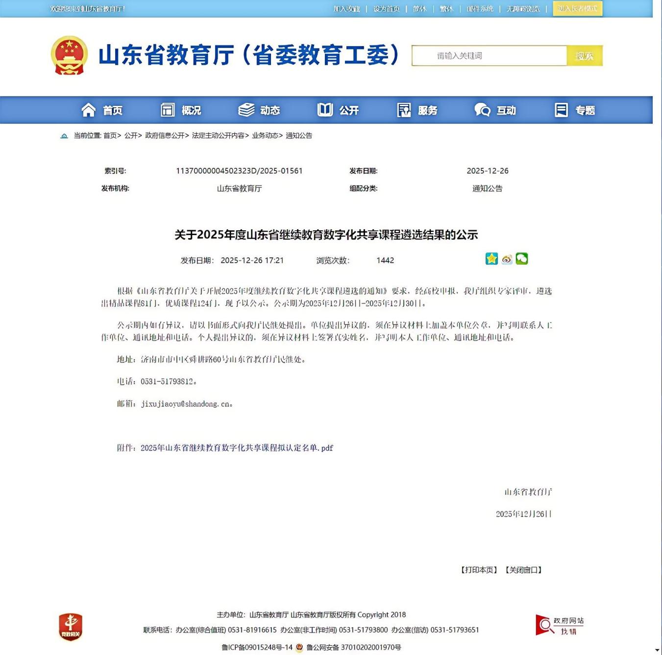 12月26日,山东省教育厅公布了2025年继续教育数字化共享课程拟认定名单,我校2门课程首次成功入选。这是我校在继续教育课程建设领域的重大突破,标志着学校职继协同发展模式下的课程建设质量迈上新台阶,也彰显了我校在继续教育起步阶段勇于探索、快速突破的创新活力与实践能力。