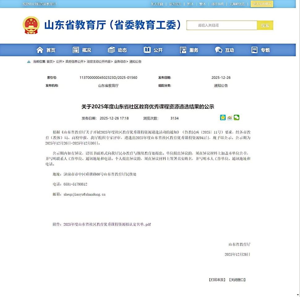 12月26日,山东省教育厅公布了2025年度山东省社区教育优秀课程资源拟认定名单,我校18门优质社区课程成功入选。此次入选数量不仅较2024年实现100%翻倍增长,更较近三年平均入选数量大幅提升170%,创下学校历年省级社区教育优秀课程资源入选数量新高,标志着我校社区教育课程建设实现跨越式发展。