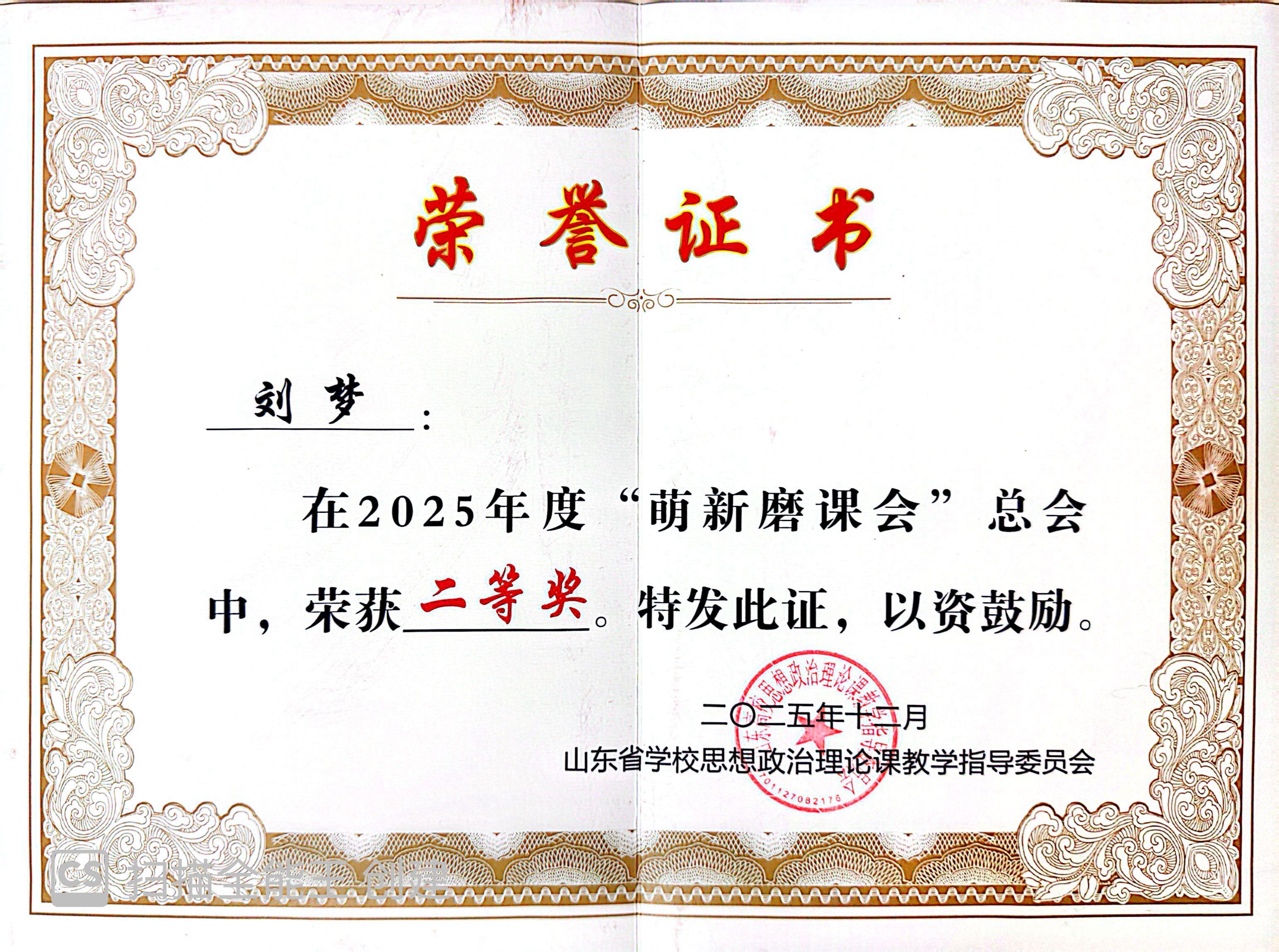 近日,山东高校思想政治理论课2025年度“萌新磨课总会”在青岛举行,我校马克思主义学院青年教师刘梦获高职组二等奖。
