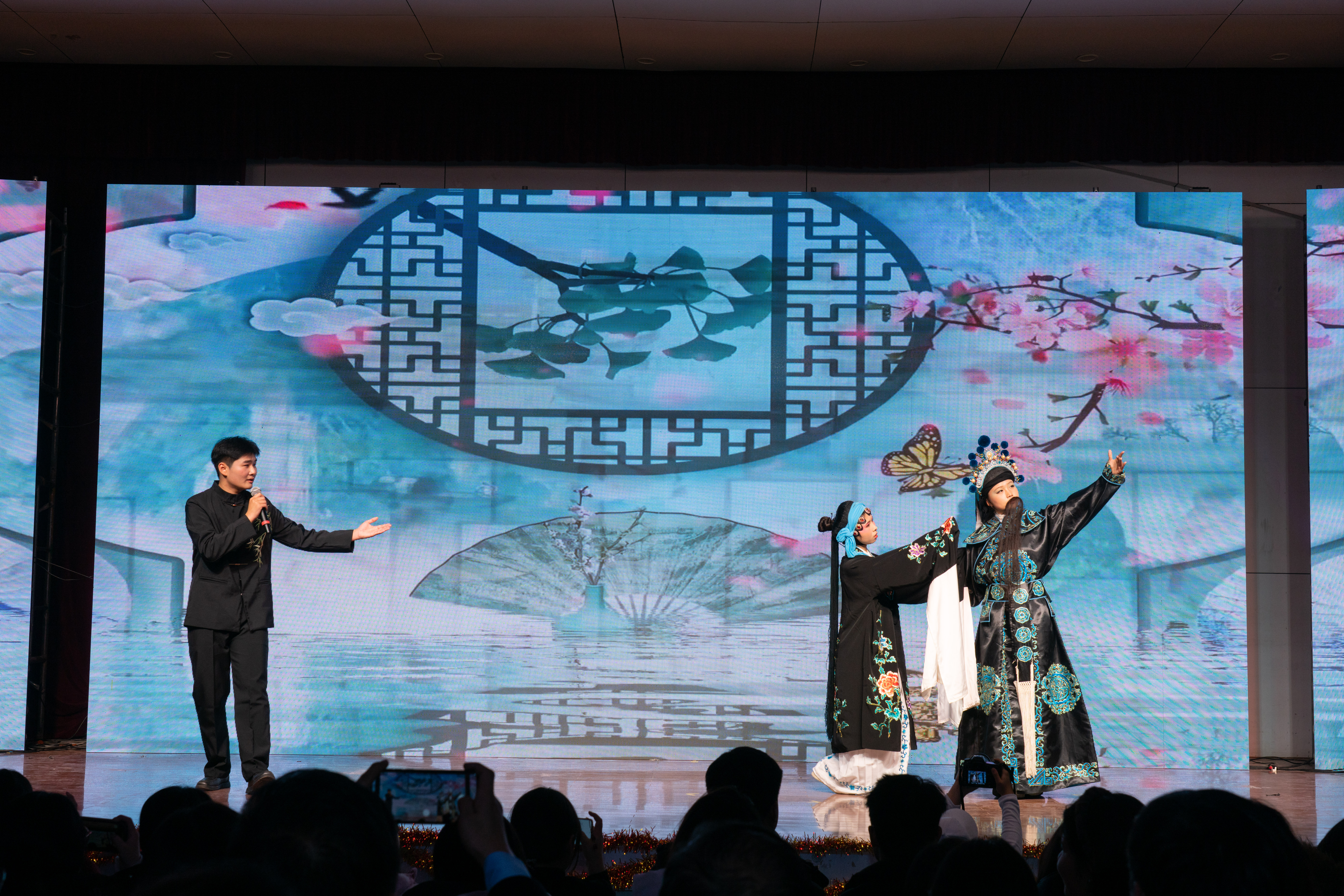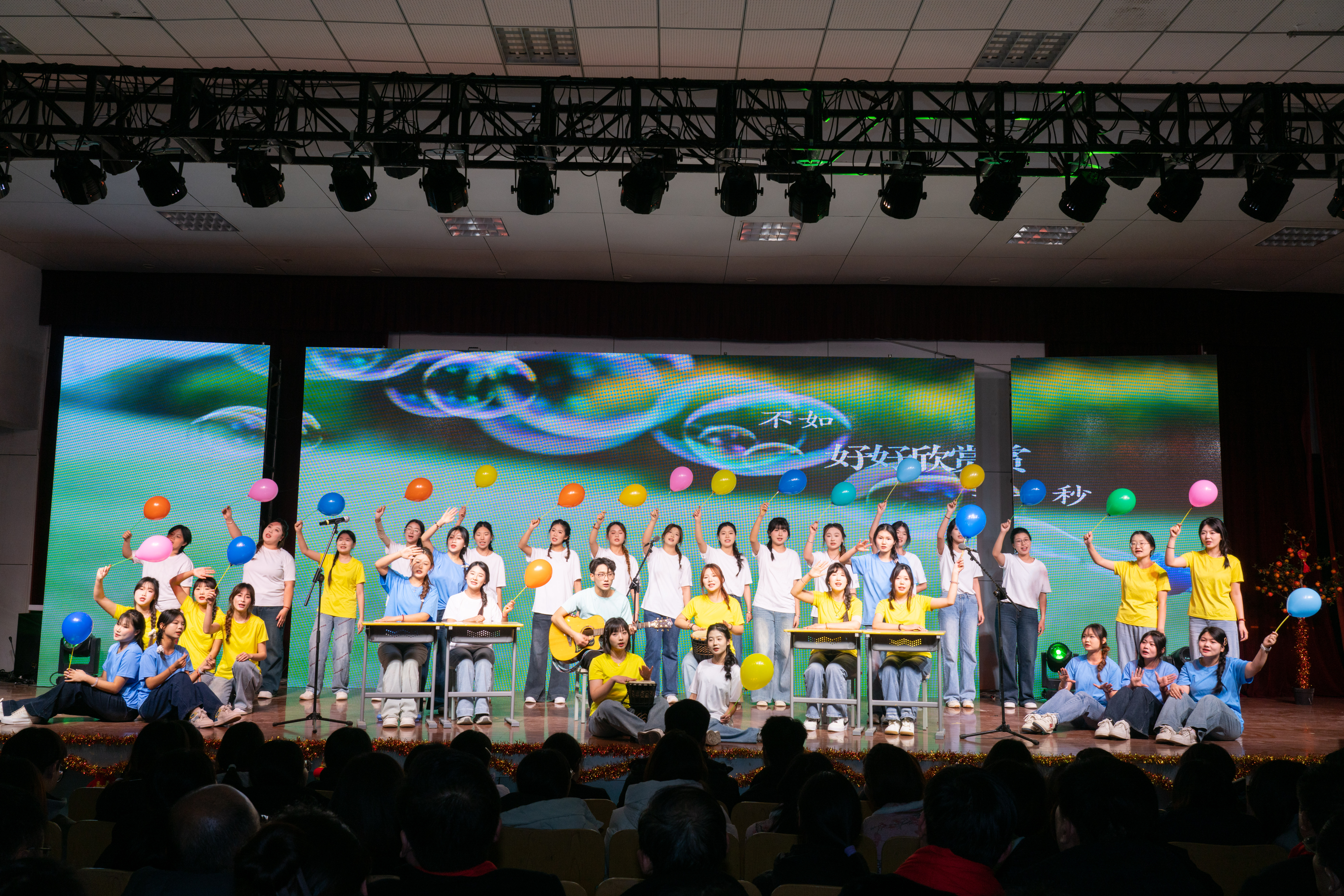 随后,精彩纷呈的节目轮番上演,为观众呈现了一场高品质的艺术盛宴。歌曲《青丝》婉转悠扬,用细腻的情感诠释了青春的情愫;相声《四大名著》创意十足,将经典文学与幽默表演相结合,让观众在欢声笑语中领略传统文化的魅力;爵士舞表演活力四射,舞者们用灵动的舞姿展现了青春的张扬与自信;励志歌曲《海阔天空》充满力量,传递出追逐梦想、无畏前行的信念。