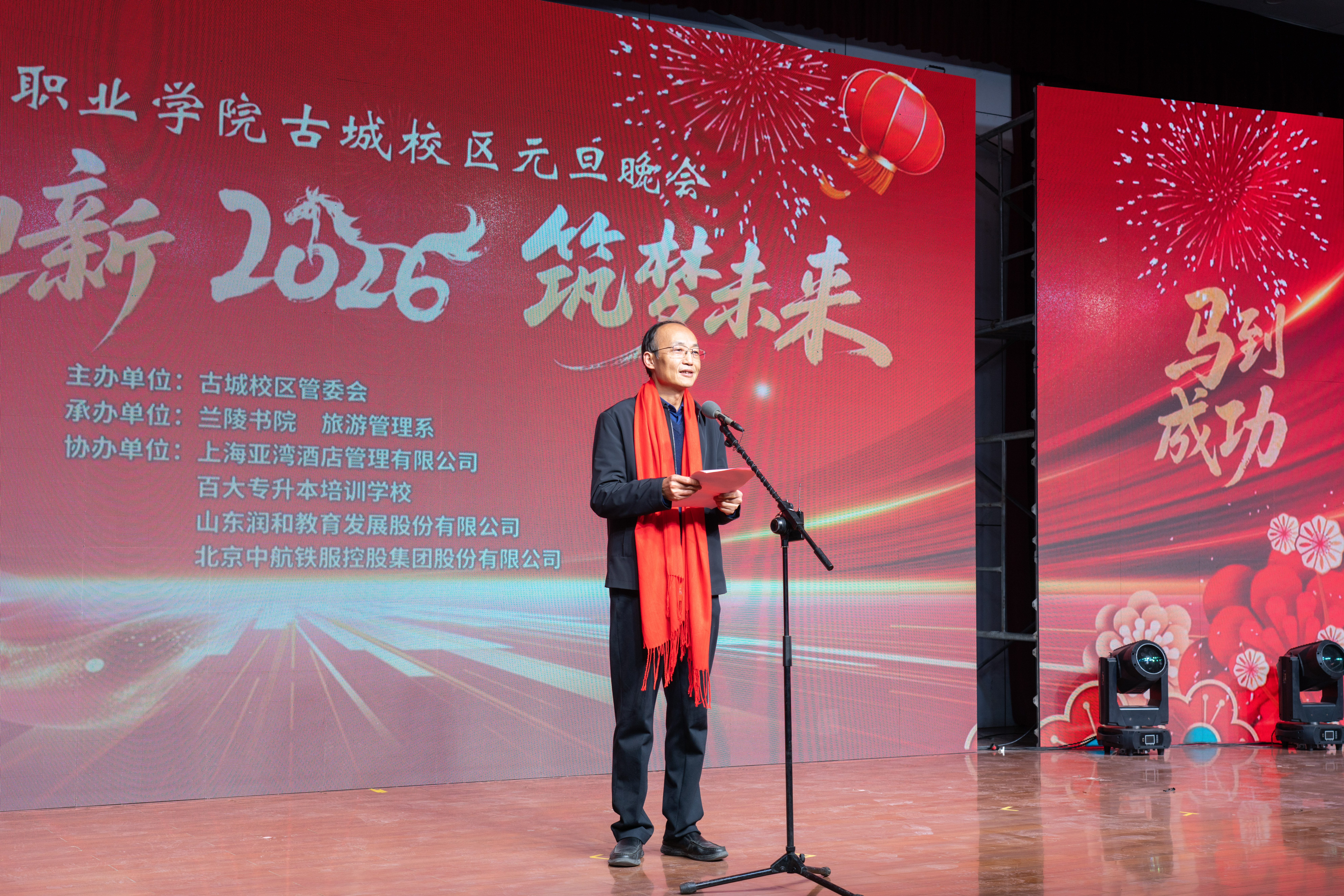 时光荏苒,岁律更新。在2026年元旦佳节即将到来之际,由古城校区管委会主办,兰陵书院、旅游管理系承办的2026年元旦晚会在师生们的热切期盼中圆满举行。学院党委委员、副院长刘希震出席并发表新年致辞。古城校区管委会、兰陵书院、旅游管理系领导与师生欢聚一堂,共赏视听盛宴,共度美好夜晚。