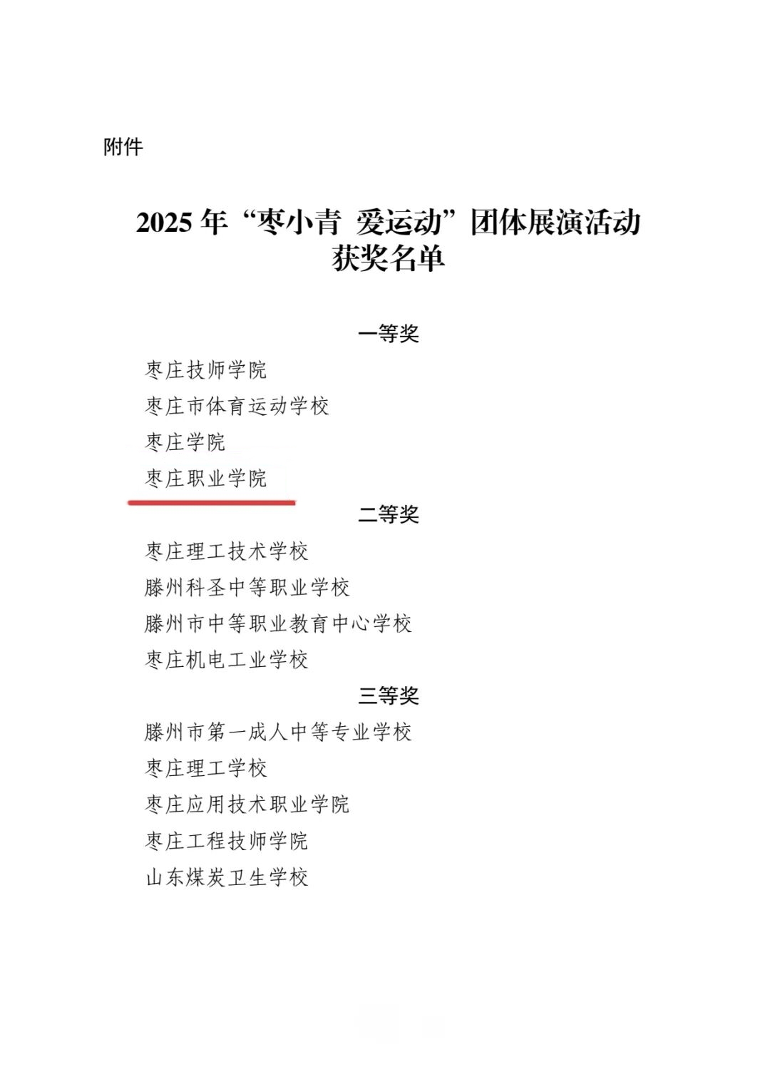 近日,由共青团枣庄市委、枣庄市教育局、枣庄市体育局联合主办的“枣小青,爱运动”全市团体展演活动圆满收官。在本次赛事中,枣庄职业学院代表队凭借精湛的现场表现力、高度的团队协作精神及昂扬向上的精神风貌,在全市众多参赛队伍中脱颖而出,最终以优异成绩荣获一等奖。