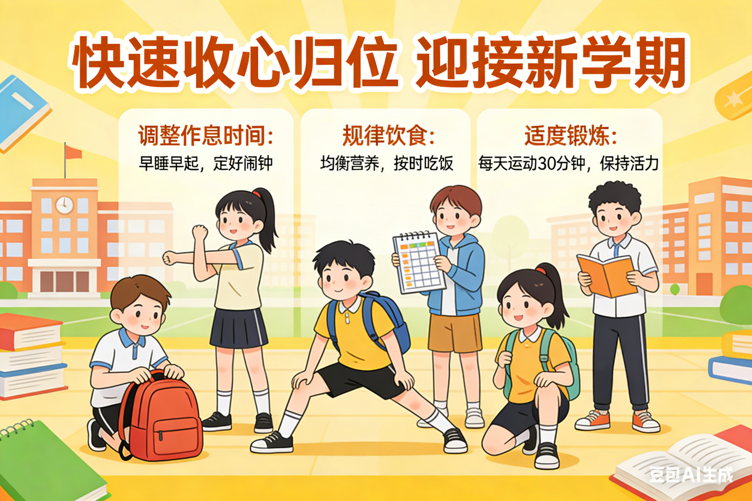 6.快速收心归位,调整状态迎新学期:请大家尽快从假期的休闲模式切换到学习模式,合理调整作息时间,规律饮食、适度锻炼,以饱满的精神、昂扬的斗志投入到新学期的课堂学习和校园生活中,为新学期的学习开好头、起好步。