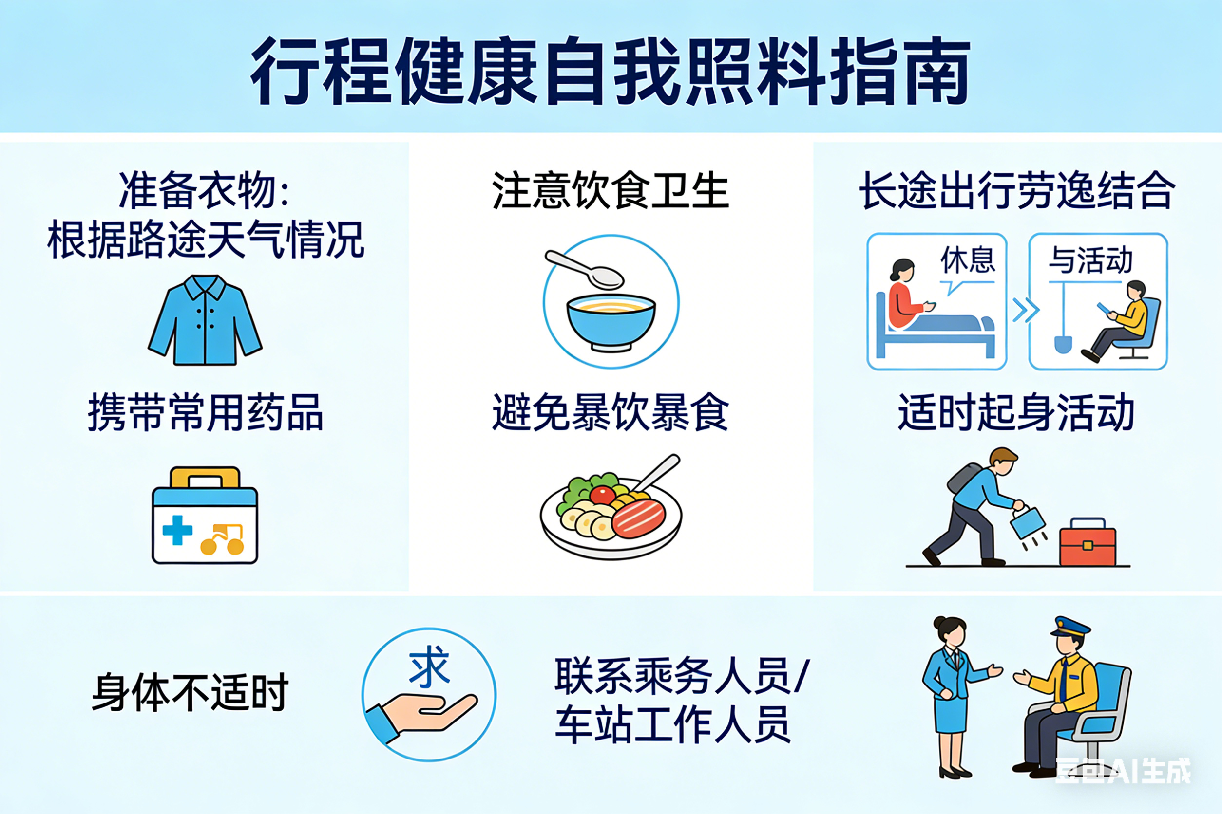 4.关注行程健康,做好自我照料:根据路途天气情况准备好衣物、常用药品,行程中注意饮食卫生,避免暴饮暴食;长途出行注意劳逸结合,适时起身活动,若行程中出现身体不适,及时联系乘务人员、车站工作人员寻求帮助。
