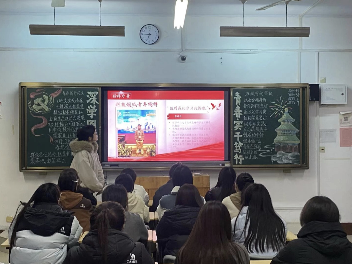 随后,各班团支书围绕“科技创新”“高质量发展”“青年担当”等关键议题,结合本专业学习重点与班级同学成长需求,分享身边优秀学子事迹、班级实践案例,将抽象理论转化为可落地的行动指南。他们号召同学们以青春之我、奋斗之我,在学业精进中锤炼本领,在集体活动中凝聚力量。