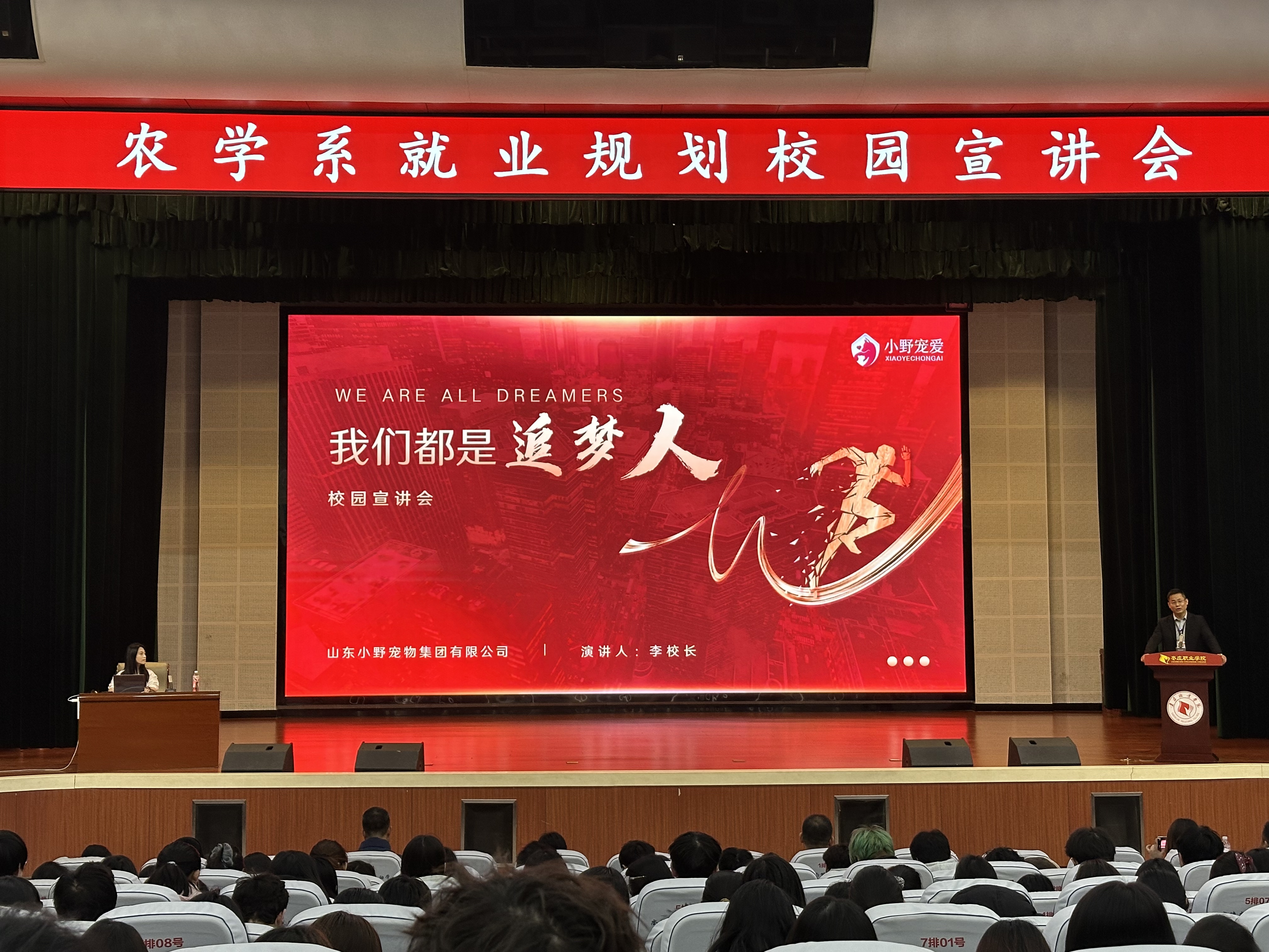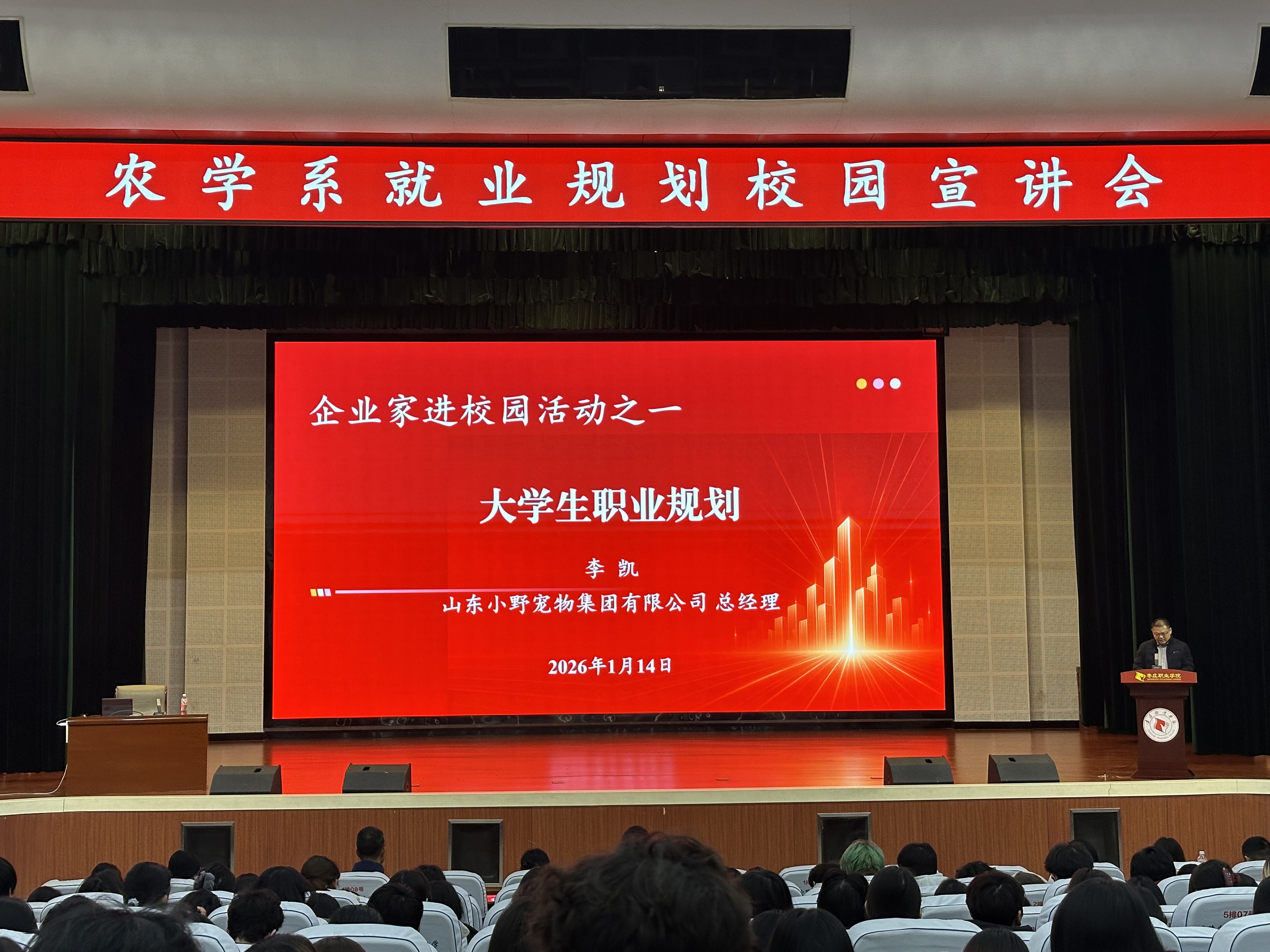 为搭建校企合作桥梁,助力农学系学生明晰职业发展路径,农学系开展了企业家进校园系列活动。1月14日下午,农学系邀请山东小野宠物集团来校在学院大礼堂开展“企业家进校园——大学生职业规划”专题讲座。山东小野宠物集团总经理、动物医疗培训学校校长李凯及企业代表出席活动,农学系主任梁春鸿、党支部副书记段修俊、教学管理办公室主任王亮,动物医学教研室全体教师及24、25级全体动医、畜牧及宠物医疗专业在校学生参加宣讲会。