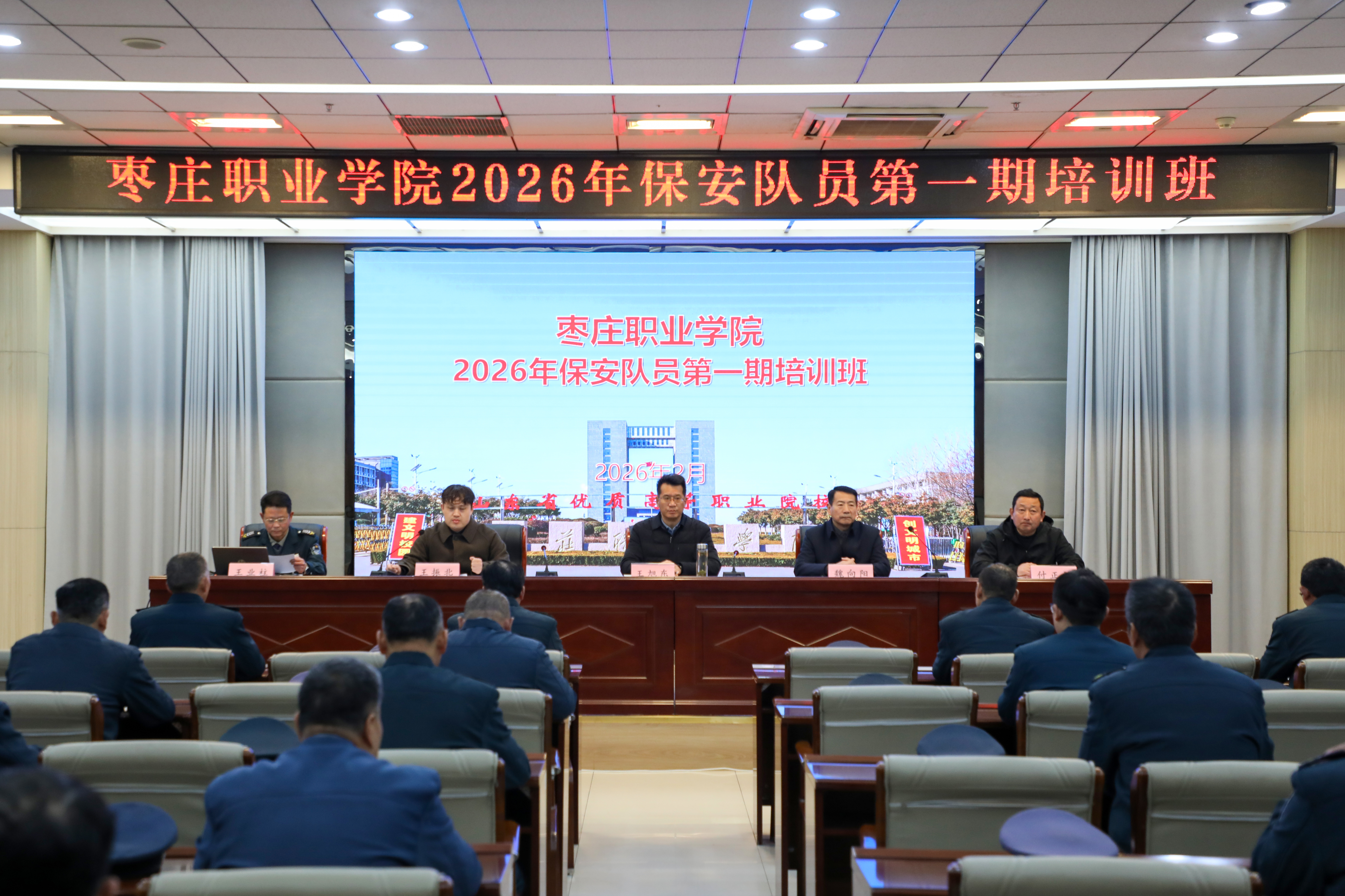 为全面提升校园保安队伍专业素养、纪律作风与应急处突能力,切实筑牢校园安全第一道防线,强化校园安全保卫工作,近日,学院2026年第一期保安队员培训班开班仪式在学术报告厅顺利举行。学院安全管理人员、枣庄市国安保安服务有限责任公司和保安队员等40余人参加了培训班。