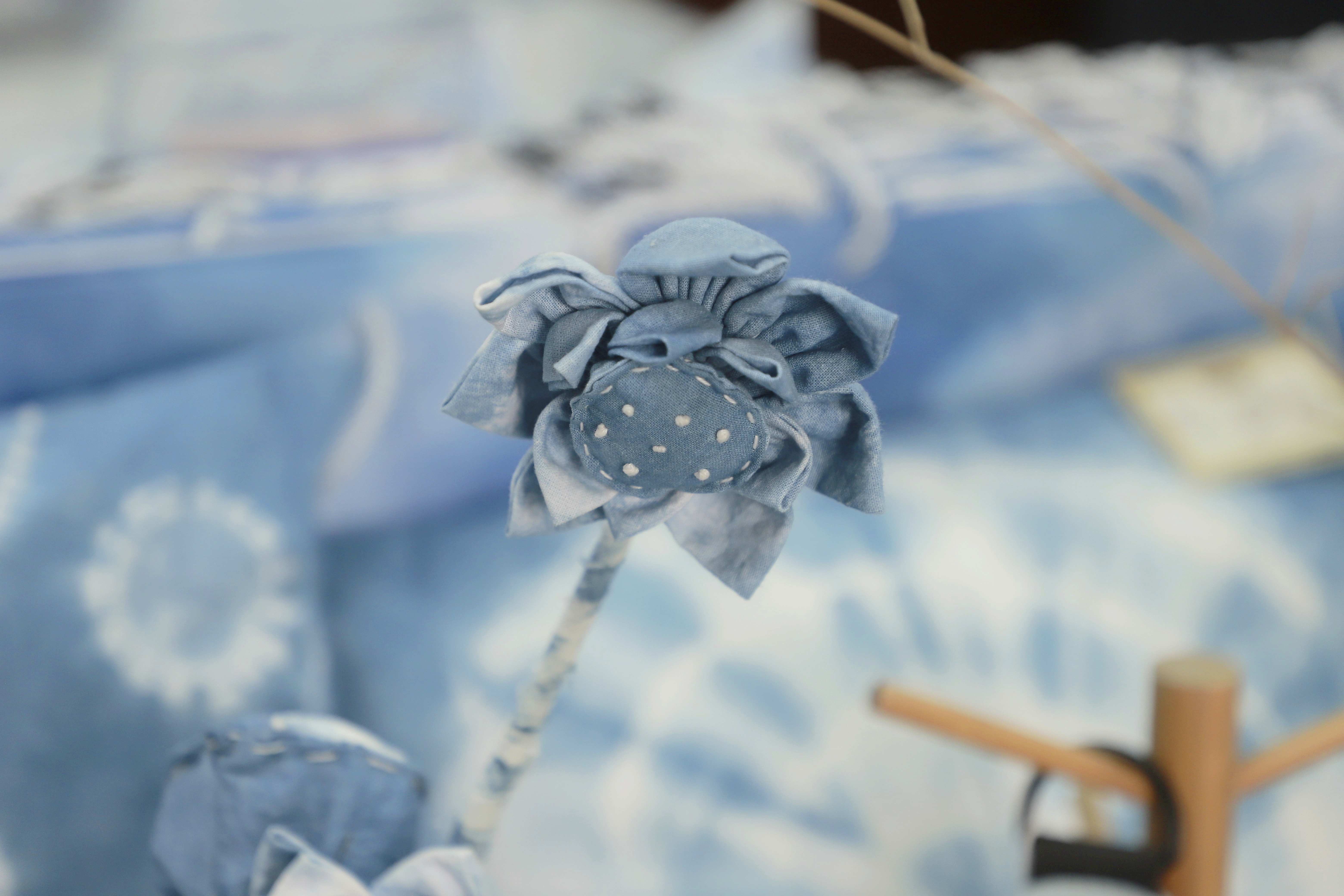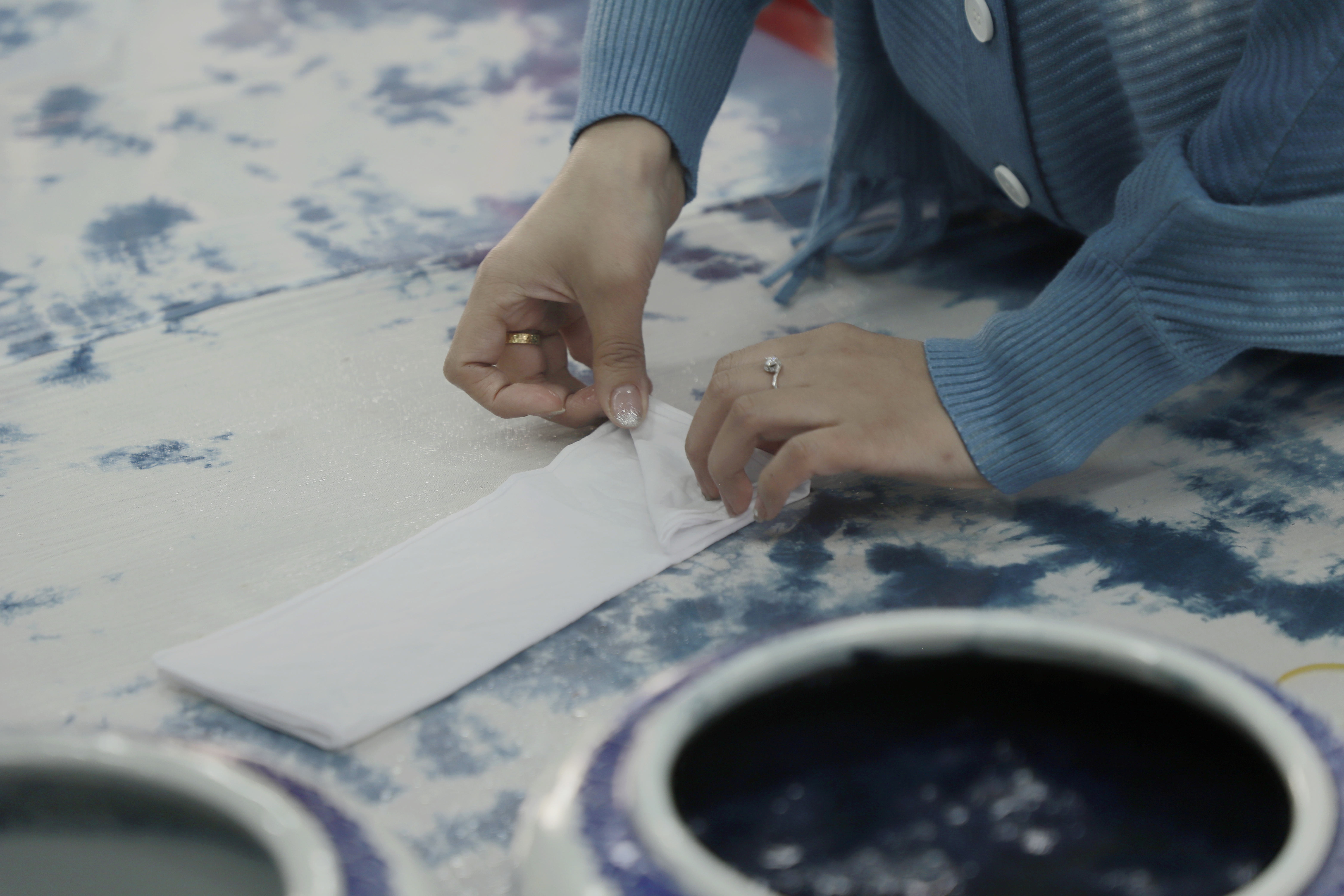 志愿者们不仅近距离观摩扎染完整制作流程,还亲手体验扎结、浸染等核心工序,在实操中体会“用力均匀”背后的千锤百炼,感受“扎得越紧留白越多,染得越久颜色越深”的工艺智慧。同时,志愿者们协助开展扎染技艺展演,向现场游客讲解扎染历史与工艺特色,引导游客参与简易扎染体验,让大家直观感受扎染拆开后那份不可预知的美感,让非遗变得可触、可感、可参与。